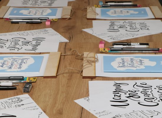 Przedstawiciele marki Pentel przygotowali dla uczestników zestawy do nauki z wykorzystaniem linii produktów dedykowanym kaligrafii, a w nich m.in. zeszyty ćwiczeń i flamastry touch brush pen. Nasz zespół własnoręcznie wykonał drewniane ramki w eklektycznym stylu, na których w końcowym etapie warsztatów powstały prawdziwe dzieła sztuki!